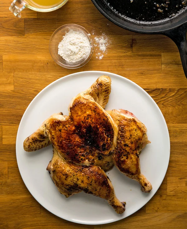 烹饪需要耐心,需要信任。炉子的低温与黄油以及鸡肉本身的脂肪相结合,会慢慢把鸡皮变得金黄酥脆,这样你就能轻松地把它从平底锅里取出来(用这段时间做米饭和扁豆)。然后是焖制。鸡肉熟透之后,从锅中取出,把锅里的肥油倒掉一些,只留几汤匙,用它快速做个肉汁。